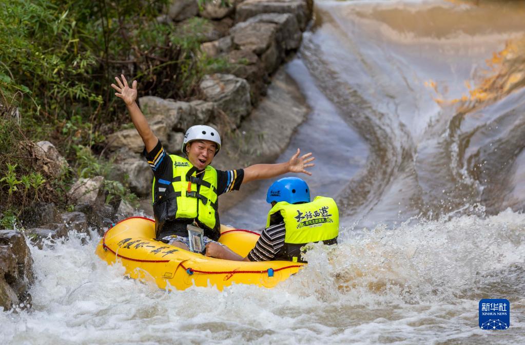 7月16日,游客在貴州省黔西市中建鄉體驗漂流。