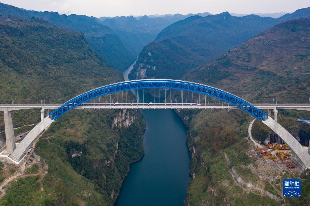 動(dòng)車(chē)組列車(chē)駛過(guò)成貴高鐵鴨池河特大橋(2019年12月2日攝,無(wú)人機照片)。新華社記者 劉續 攝
