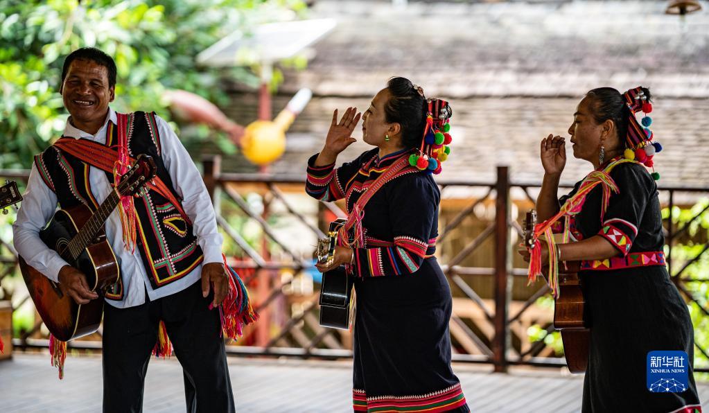 在云南省普洱市瀾滄拉祜族自治縣老達保村,致富帶頭人、拉祜族村民李娜倮(中)帶領(lǐng)村民演出(2022年7月5日攝)。新華社記者江文耀攝