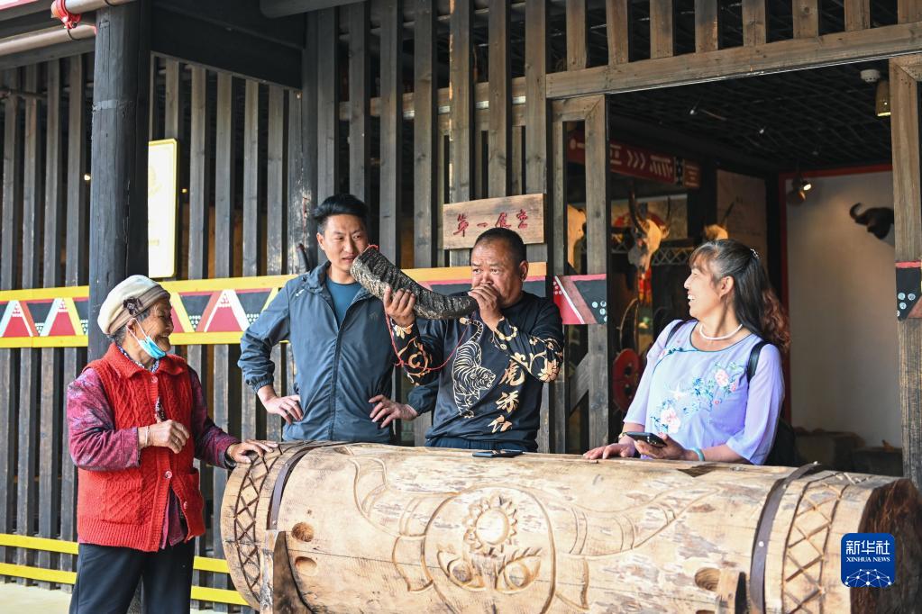游客在云南省騰沖市清水鄉三家村中寨司莫拉佤族村體驗傳統樂(lè )器(2022年3月31日攝)。新華社記者 曹夢(mèng)瑤 攝