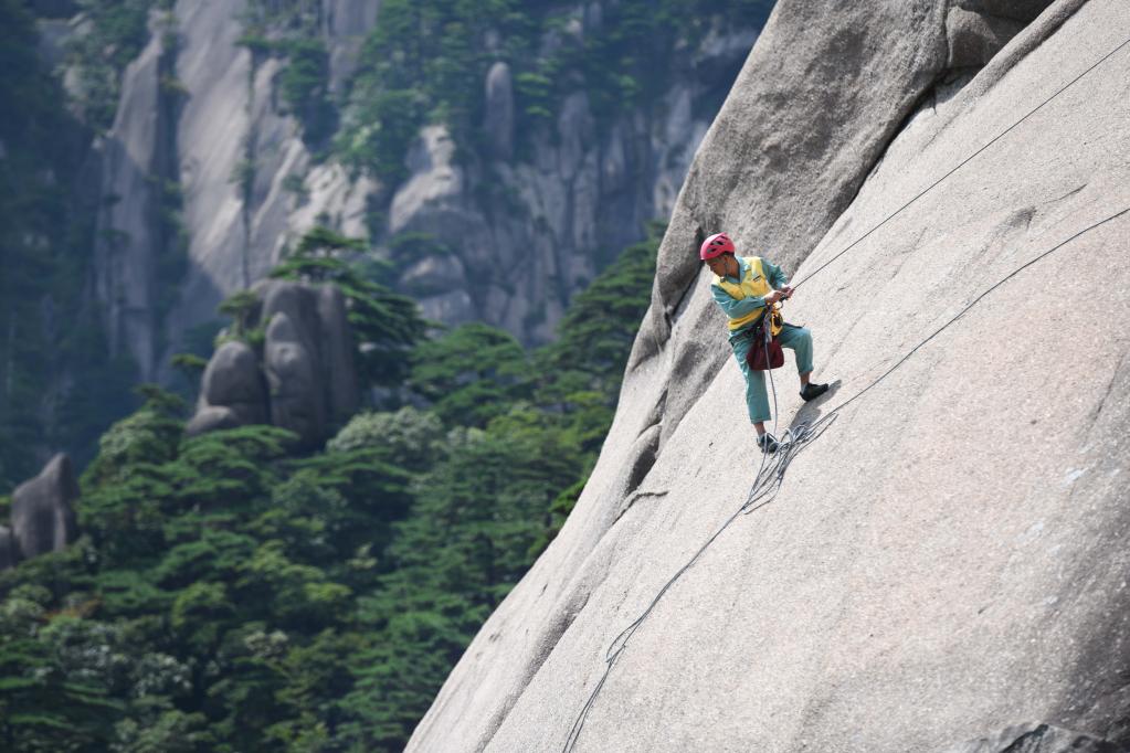 此后,在黃山的懸崖峭壁間,游客時(shí)常能看到一位頭戴安全帽、身系登山繩的黝黑漢子像“蜘蛛俠”一樣身形矯健地穿梭于山間。