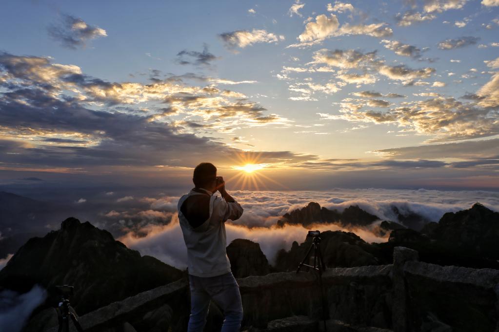 游客拍攝黃山云海(6月2日攝)。新華社發(fā)(梅建 攝)