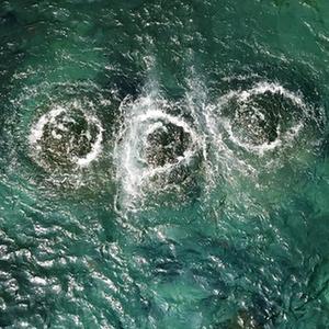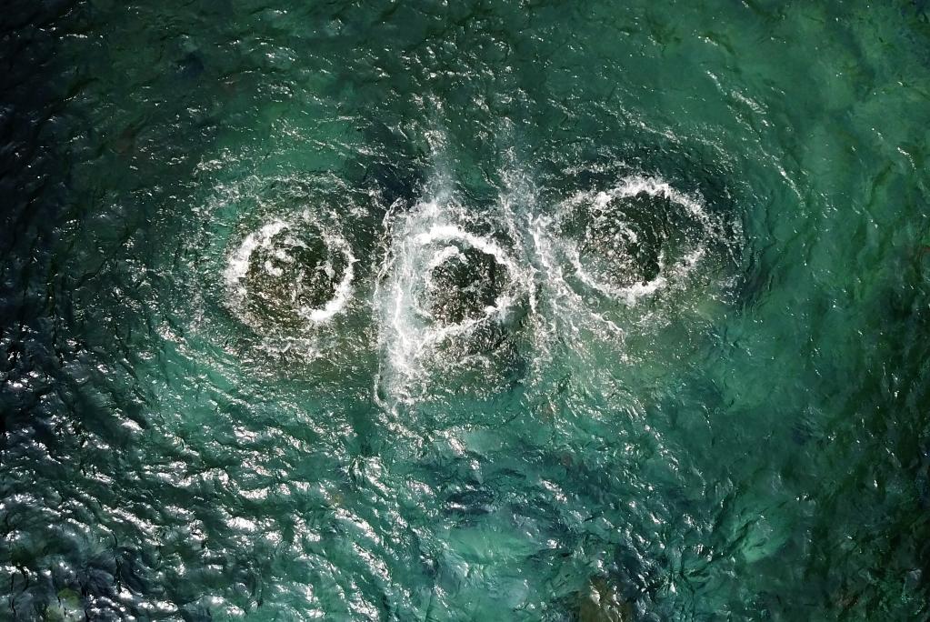 在一方清池中,趵突泉的三股泉水噴涌歡騰(無(wú)人機拍攝)。(新華社記者徐速繪攝)