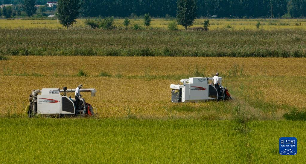9月16日,河北唐山蘆臺經(jīng)濟開(kāi)發(fā)區海北鎮大海北村農民利用收割機收獲水稻(無(wú)人機照片)。