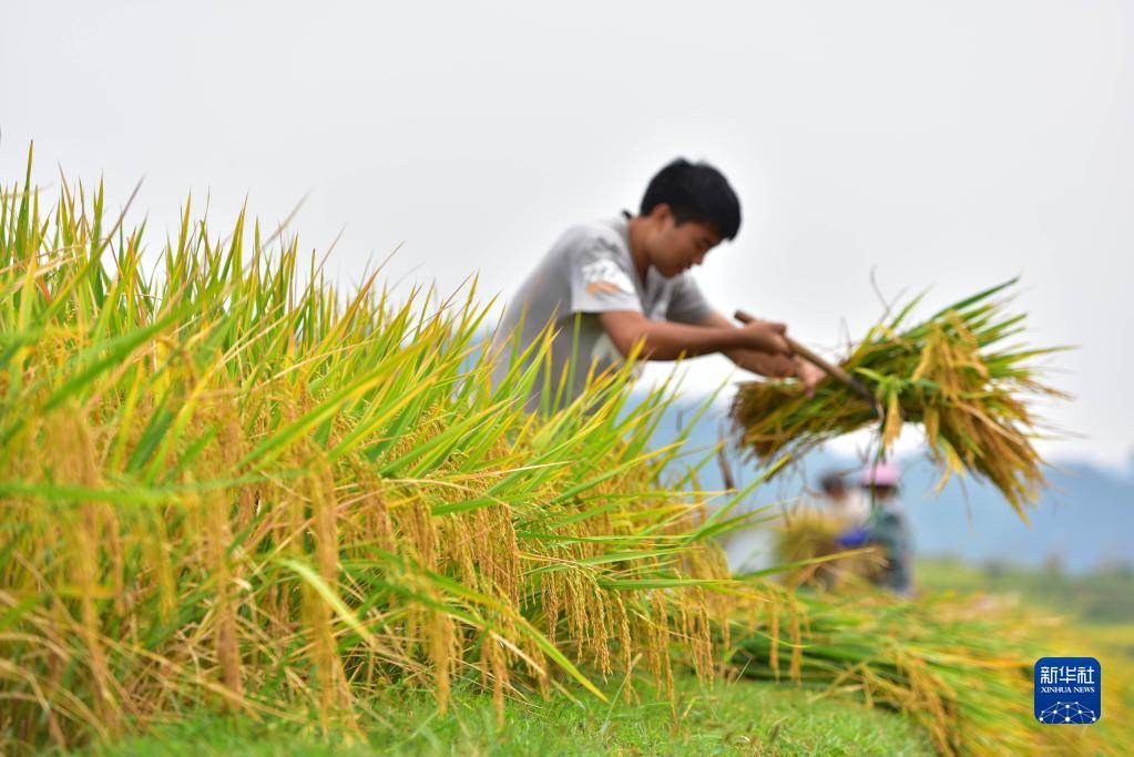 9月11日,貴州省丹寨縣龍泉鎮高要村村民在梯田里收稻谷。