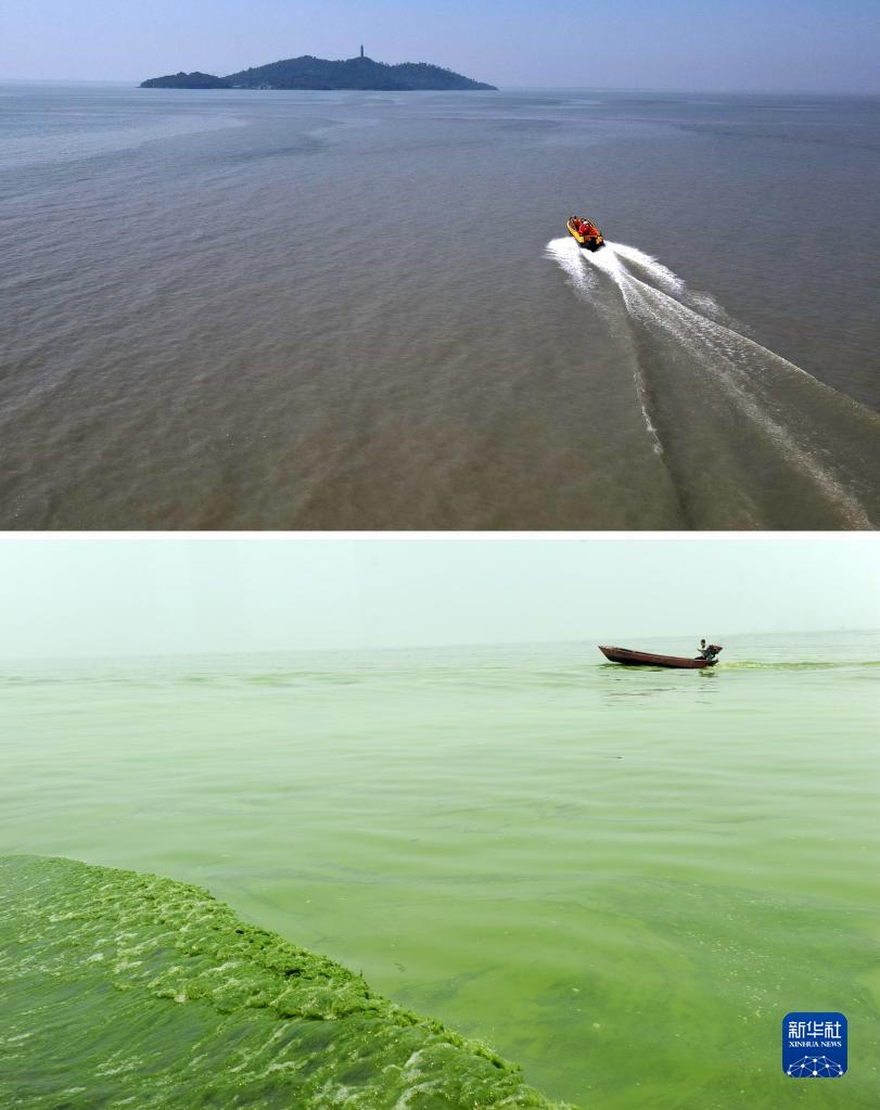 這是一張拼版照片:上圖為2022年9月6日拍攝的游船在巢湖湖面航行(無(wú)人機照片);下圖為2012年6月9日拍攝的漁船在巢湖湖面航行。