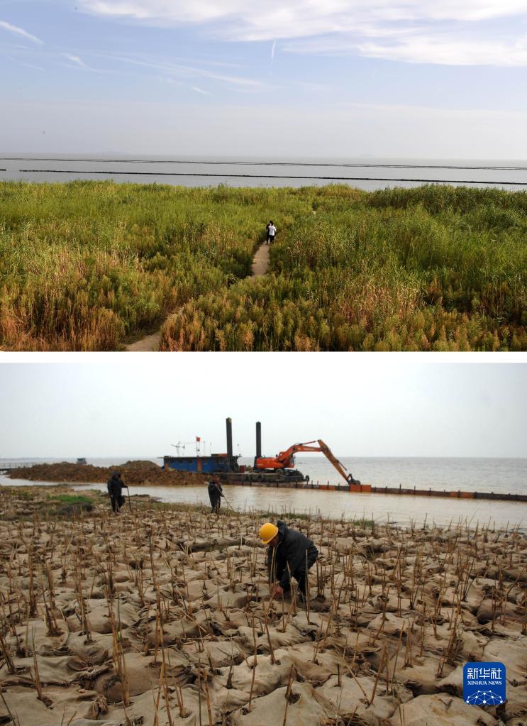 這是一張拼版照片:上圖為2022年9月6日拍攝的巢湖岸邊的蘆葦濕地(新華社記者劉軍喜攝);下圖為2010年4月6日拍攝的工作人員在巢湖岸邊種植蘆葦。