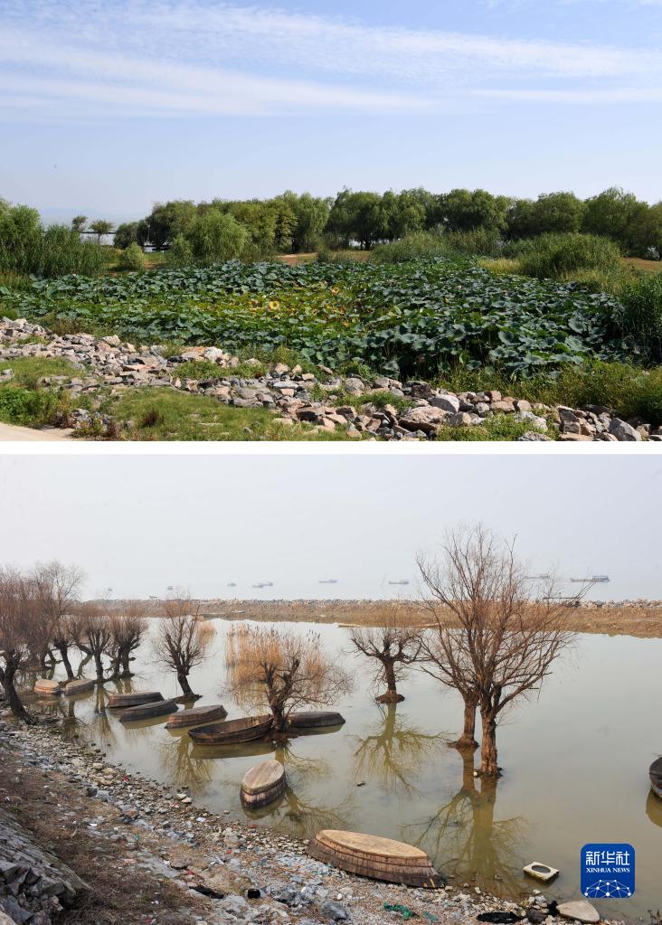 這是一張拼版照片:上圖為2022年9月6日拍攝的巢湖岸邊的濕地(新華社記者劉軍喜攝);下圖為2012年2月17日拍攝的巢湖岸邊的樹(shù)木(何希斌攝)。