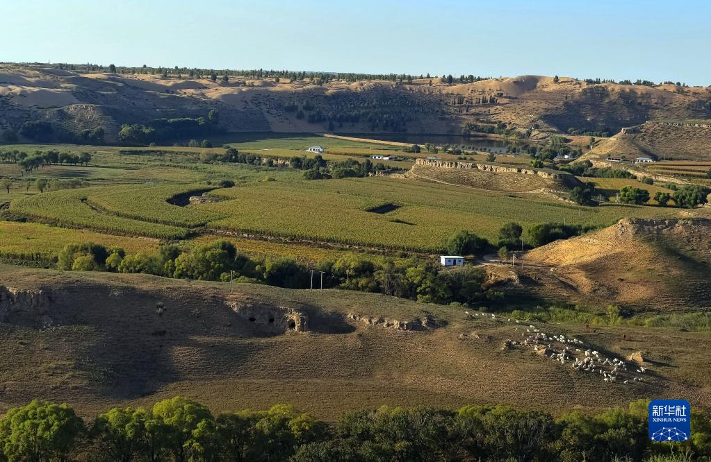 9月20日在內蒙古鄂爾多斯市烏審旗無(wú)定河鎮境內拍攝的無(wú)定河流域田園景色。