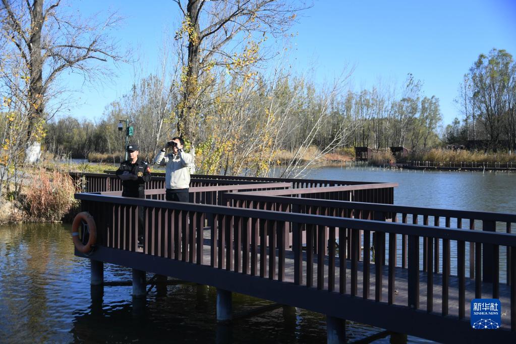 在翠湖國家城市濕地公園,張庚(右)與安保人員一起巡視(2022年11月7日攝)。