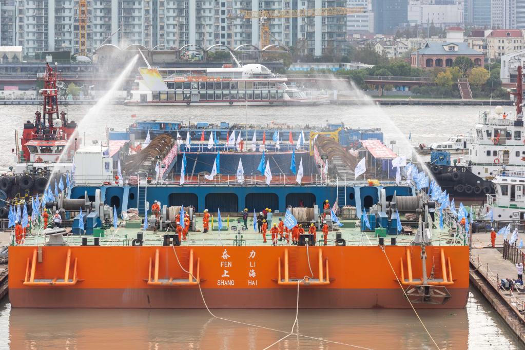 “奮力”輪載著(zhù)古船進(jìn)入船塢。新華社記者金立旺 攝