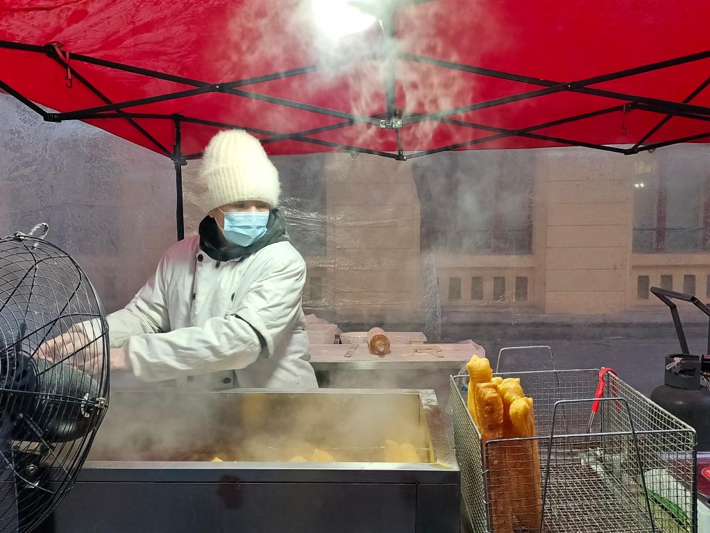 2月3日6點(diǎn)多,天空破曉,流動(dòng)攤位早已在哈爾濱市紅專(zhuān)街兩側一字排開(kāi),賣(mài)凍水果、活魚(yú)、元宵、調料以及油條、油炸糕、煎餅等特色小吃的商戶(hù)們裹著(zhù)軍大衣、穿著(zhù)厚棉鞋,一邊扯著(zhù)嗓子叫賣(mài),一邊用勁兒跺著(zhù)腳。