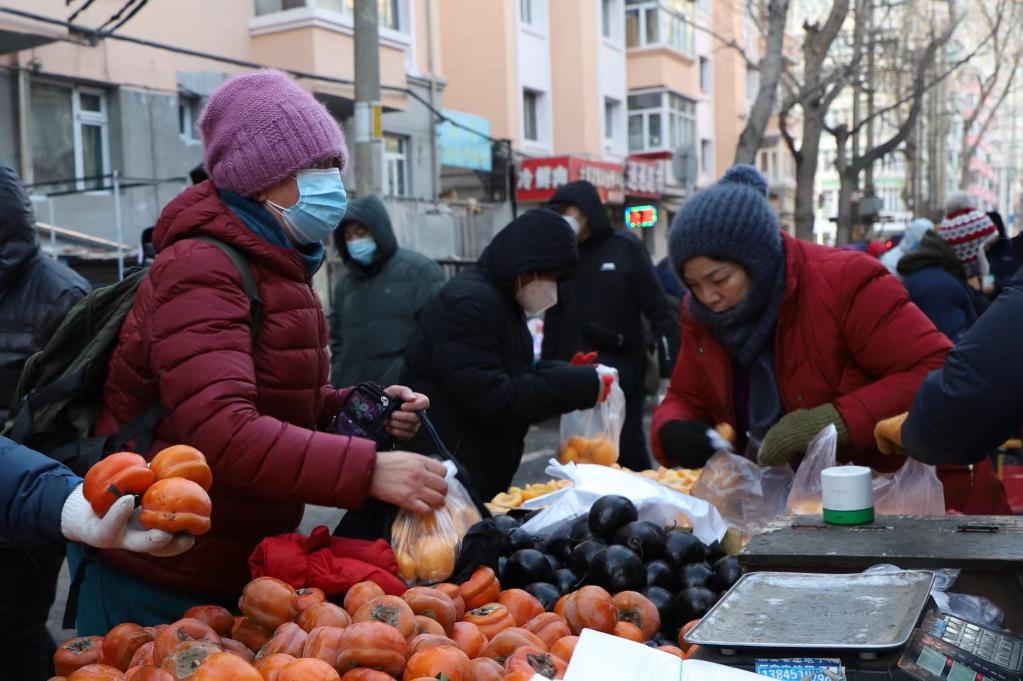 “嘎嘎甜的大柿子兩塊錢(qián)一斤!”“東北大苞米兩元一個(gè),五元錢(qián)仨!”……喇叭聲和叫賣(mài)聲此起彼伏,山竹色的凍梨、橙色的凍柿子、冷紅色的凍草莓吸引著(zhù)來(lái)往人們的目光。