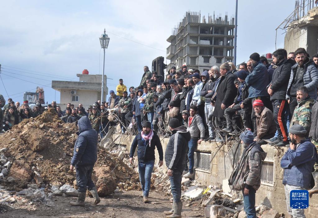 2月7日,人們聚集在敘利亞拉塔基亞省的一處地震廢墟。新華社發(fā)