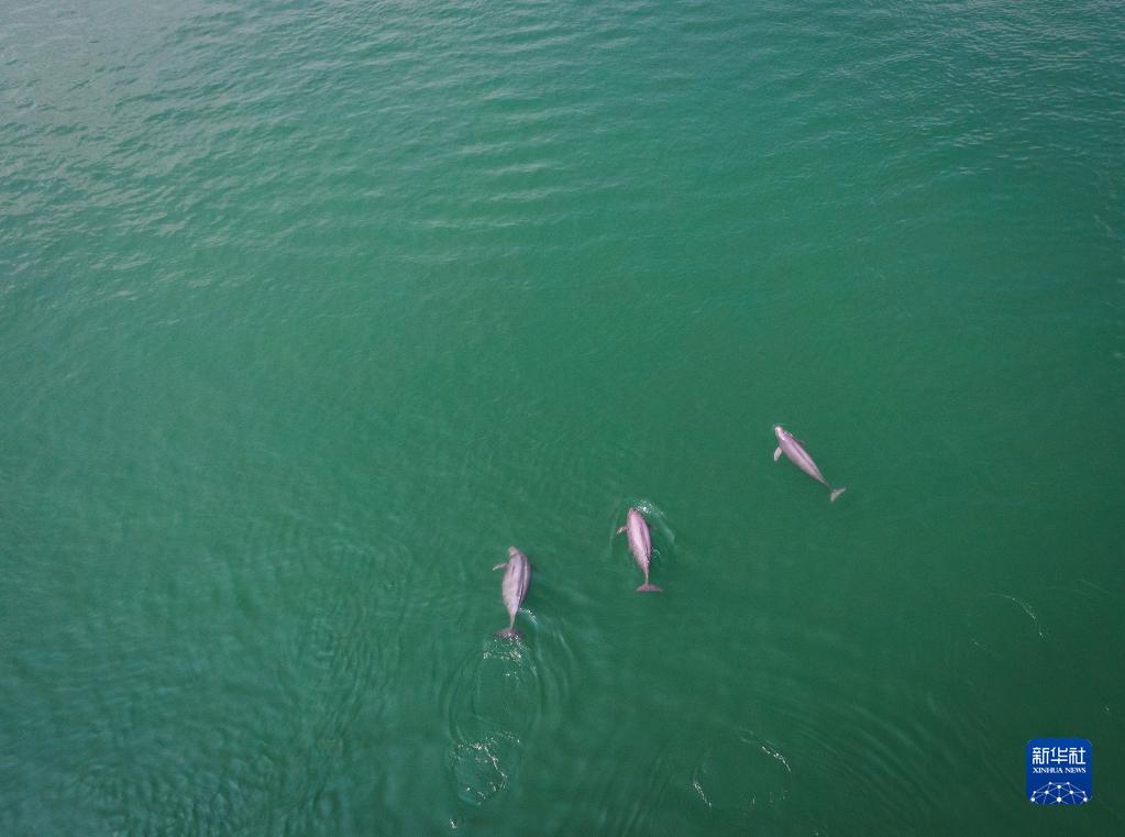 在湖北省宜昌市,長(cháng)江江豚在水中嬉戲(2021年5月11日攝,無(wú)人機照片)。新華社記者 肖藝九 攝