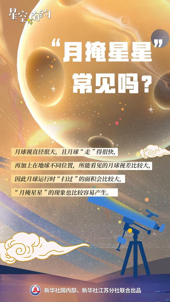 中科院紫金山天文臺科普部主管王科超介紹,月球在運行過(guò)程中,在視線(xiàn)方向上恰好遮擋住天體,就會(huì )形成“月掩星星”的現象,原理與日食類(lèi)似?!霸虑蛞曋睆胶艽?,且月球‘走’得很快,再加上在地球不同位置,所能看見(jiàn)的月球視差比較大,因此月球運行時(shí)‘掃過(guò)’的面積會(huì )比較大,‘月掩星星’的現象也比較容易產(chǎn)生?!?/p>