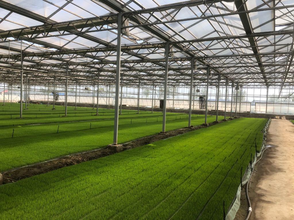 遼寧省盤(pán)錦市太平凱地農機服務(wù)專(zhuān)業(yè)合作社,一座育苗大棚內的秧苗。新華社記者鄒明仲 攝