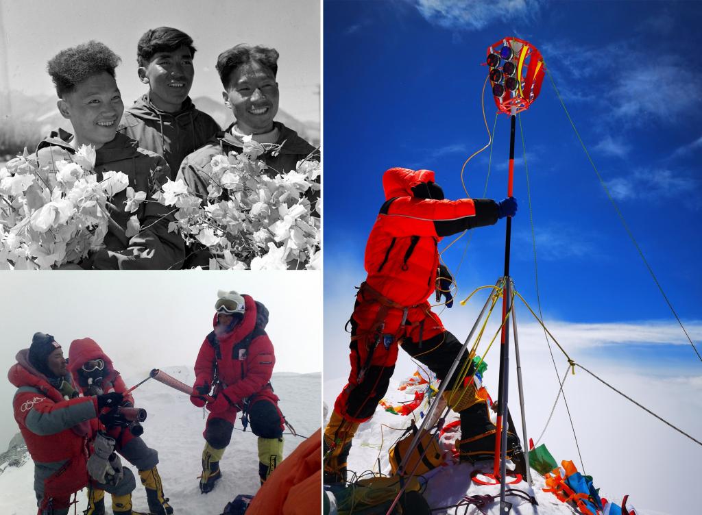 拼版照片:左上圖為1960年5月登上珠穆朗瑪峰峰頂的中國登山隊隊員王富洲(右)、貢布(中)和屈銀華(資料照片,新華社發(fā));左下圖為2008年5月8日,北京奧運圣火珠峰傳遞登山隊隊員羅布占堆(左)點(diǎn)燃第一棒火炬手吉吉手中的“祥云”火炬(新華社發(fā));右圖為2020珠峰高程測量登山隊隊員在珠穆朗瑪峰峰頂開(kāi)展測量工作(2020年5月27日新華社特約記者扎西次仁攝)