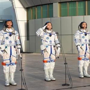 這是航天員景海鵬(右)、朱楊柱(中)、桂海潮在出征儀式上。新華社記者 李志鵬 攝