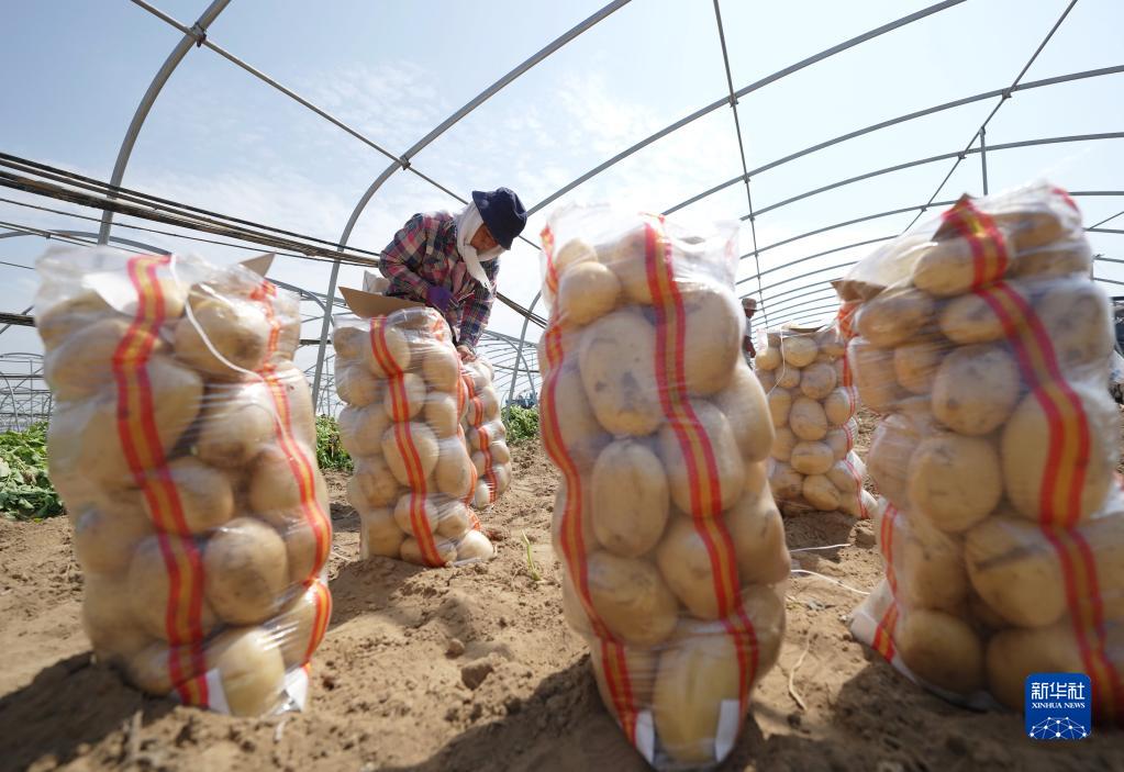 6月8日,昌黎縣新集鎮西新莊村農民在田間將收獲的馬鈴薯打包。