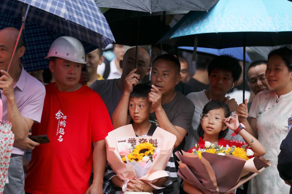 6月9日,在湖南省資興市立中學(xué)考點(diǎn),人們手捧鮮花在考場(chǎng)外等待考生走出。