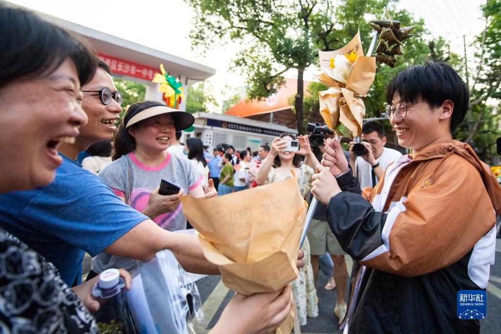 6月9日,在長(cháng)沙市第一中學(xué)考點(diǎn),家長(cháng)們迎接考生(右一)走出考場(chǎng)。