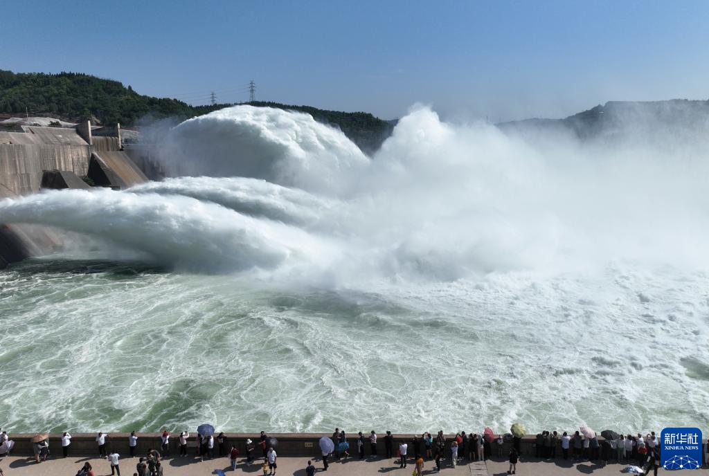 6月23日,游客在黃河小浪底水利樞紐工程出水口觀(guān)看調水調沙(無(wú)人機照片)。