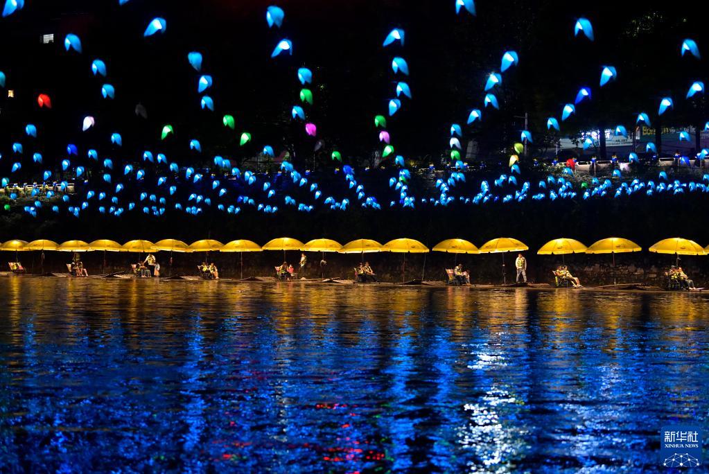 6月22日晚,游客在湖北省宣恩縣城貢水河上乘坐竹筏賞夜景。