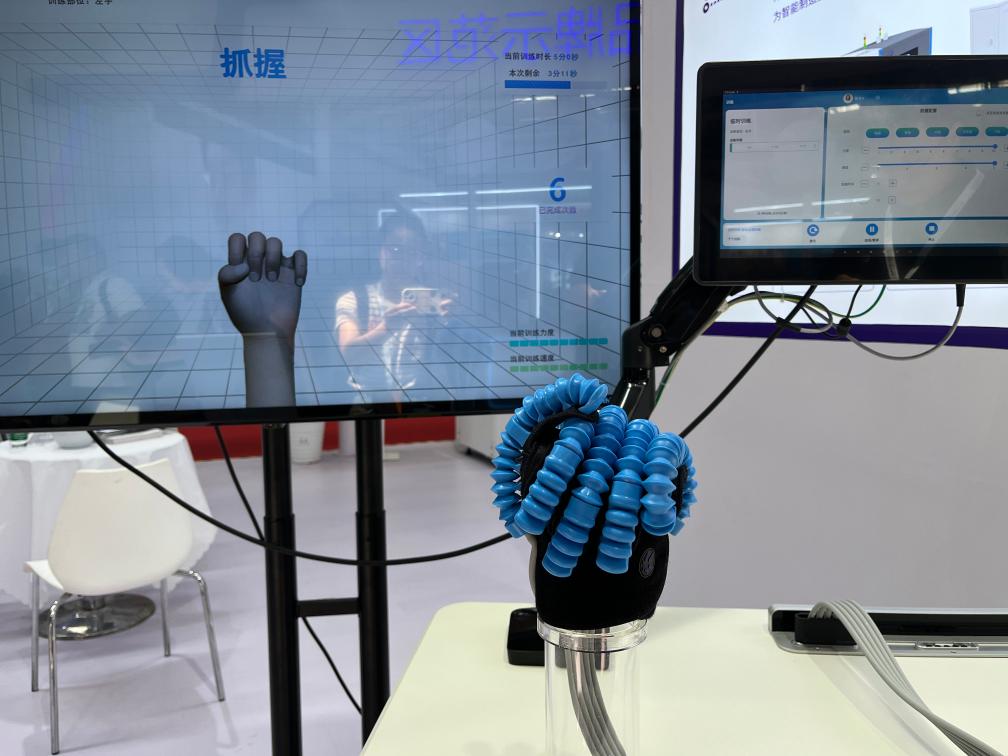 16日,2023世界機器人大會(huì )博覽會(huì )上展出的手部康復機器人。(新華社記者 陽(yáng)娜 攝)