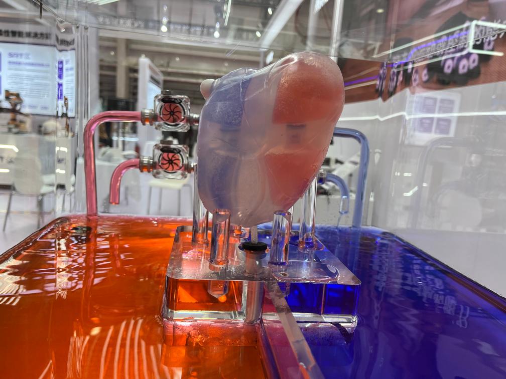 16日,2023世界機器人大會(huì )博覽會(huì )上展出的人工心臟。(新華社記者 陽(yáng)娜 攝)