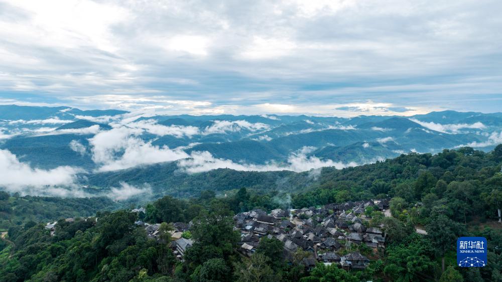 被山林與茶園環(huán)繞的景邁山翁基古寨一景(無(wú)人機照片,9月17日攝)。新華社記者 胡超 攝