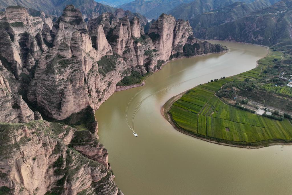 9月21日,游客乘坐快艇前往炳靈寺石窟參觀(guān)(無(wú)人機照片)。新華社記者 郎兵兵 攝
