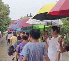 風(fēng)雨中,他們自發(fā)撐起30米長(cháng)“斜式傘橋”。