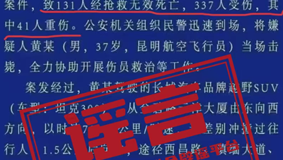 近日,有網(wǎng)民散布虛假的“警情通報”,造謠傳播云南昆明交通事故“致131人死亡,337人受傷”等不實(shí)信息,公安機關(guān)核查后,依法對造謠者進(jìn)行了刑事拘留?!八{底白字”的“警情通報”是公安機關(guān)權威發(fā)布的重要渠道。不法分子竟敢冒用官方標識,將“2死9傷”惡意篡改成“131人死亡、337人受傷”,并編造聳人聽(tīng)聞的細節,真是膽大包天!