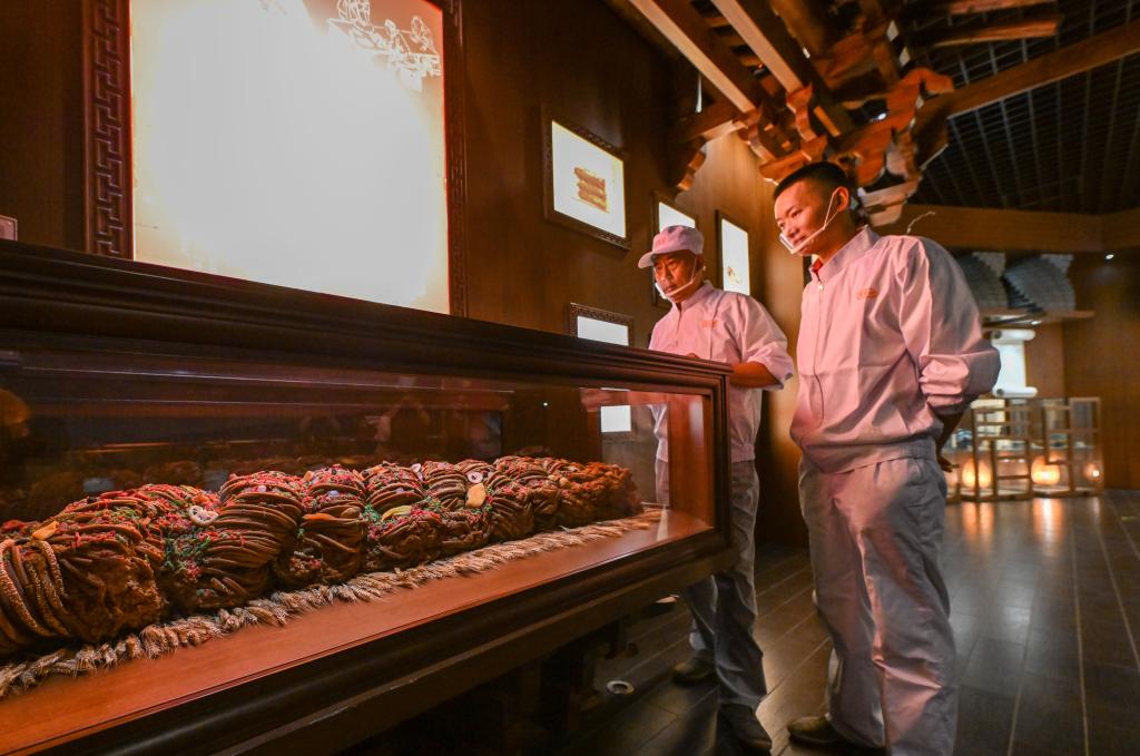 在天津桂發(fā)祥十八街麻花文化館,王洪德(左)和徒弟趙寶陽(yáng)欣賞重達百斤的巨型麻花(6月8日攝)。