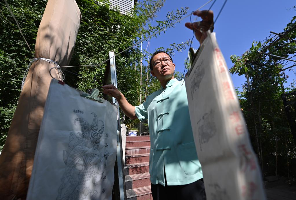 在天津市西青區的楊柳青霍氏古一張畫(huà)店,霍樹(shù)林把印好的“畫(huà)坯子”進(jìn)行晾曬(6月6日攝)。