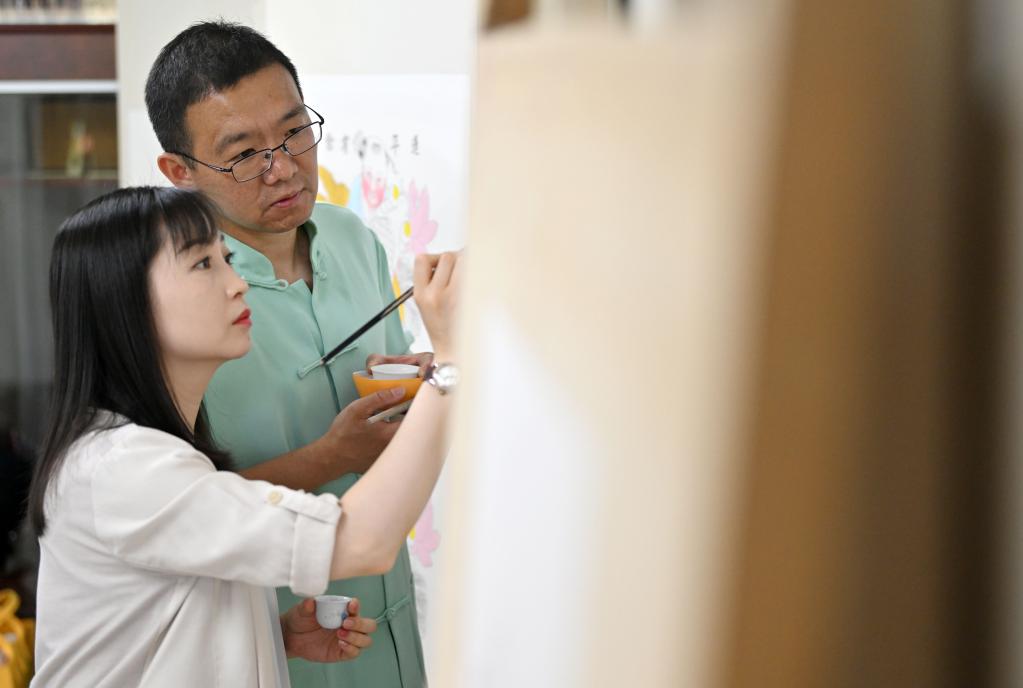 在天津市西青區的楊柳青霍氏古一張畫(huà)店,霍樹(shù)林(左)和妻子王丹一起進(jìn)行彩繪(6月6日攝)。