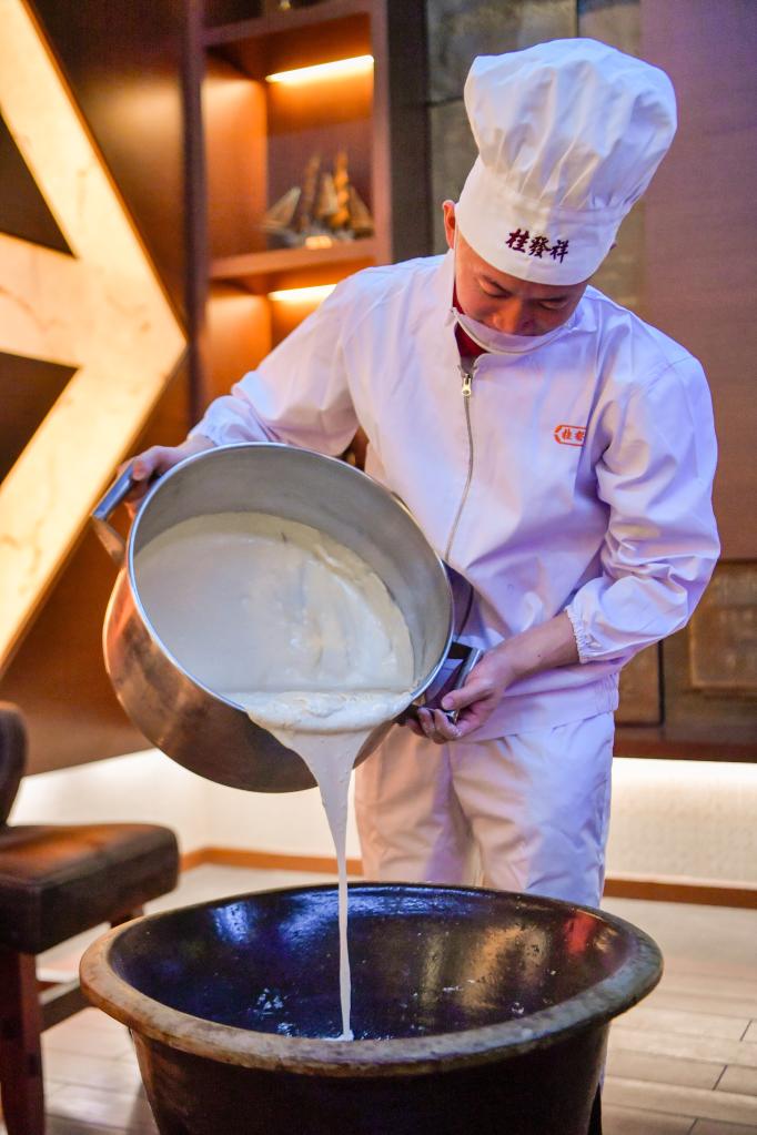 在天津桂發(fā)祥十八街麻花文化館,趙寶陽(yáng)為手工麻花制作準備餡料(6月8日攝)。