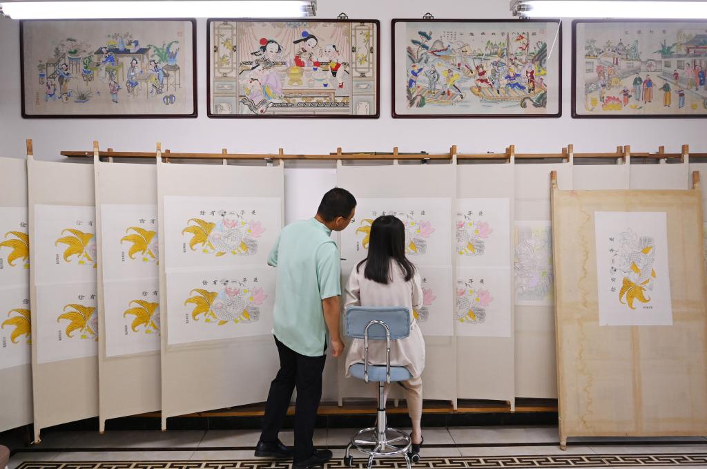 在天津市西青區的楊柳青霍氏古一張畫(huà)店,霍樹(shù)林(右)和妻子王丹一起進(jìn)行彩繪(6月6日攝)。
