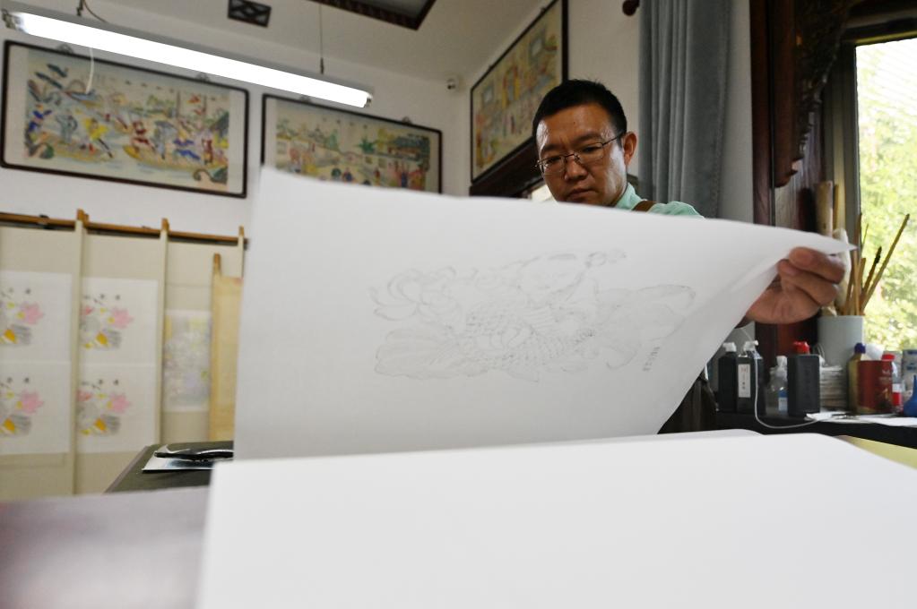 霍樹(shù)林在天津市西青區的楊柳青霍氏古一張畫(huà)店準備進(jìn)行勾線(xiàn)(6月6日攝)。