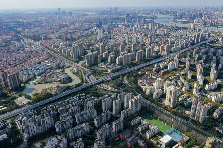 圖為2020年11月12日拍攝的上海龍陽(yáng)路立交橋附近的商品房(無(wú)人機照片)。新華社記者 丁汀 攝