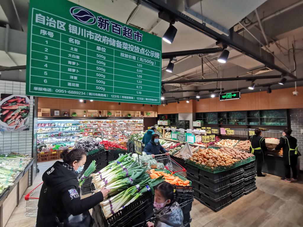 在寧夏銀川市新百連超老大樓店里,市民在挑選蔬菜。(新華社記者 靳赫 攝)