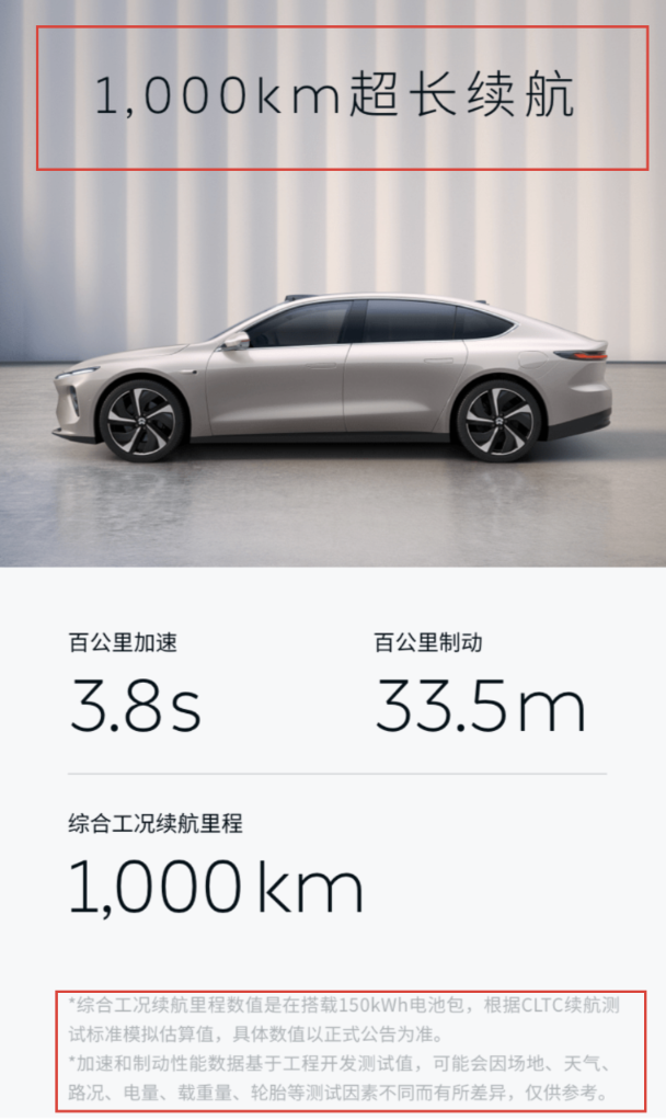 記者調查發(fā)現,一些車(chē)企在宣傳時(shí)往往使用的是理想條件下的續航里程。記者登錄多家知名新能源汽車(chē)官方網(wǎng)站發(fā)現,各大網(wǎng)站對于車(chē)輛續航里程描述普遍“理想化”,比如,有的大幅展示現實(shí)綜合工況續航里程1000公里,而在屏幕最下方很不起眼的小字中,解釋了綜合工況續航里程是采用了尚未量產(chǎn)的電池包等附加條件。