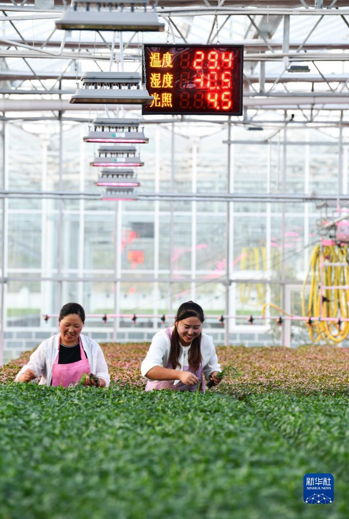 農民在貴州省龍里縣灣灘河鎮園區村的人工智能調控大棚內管護黃瓜苗(3月19日攝)。新華社記者 楊文斌 攝