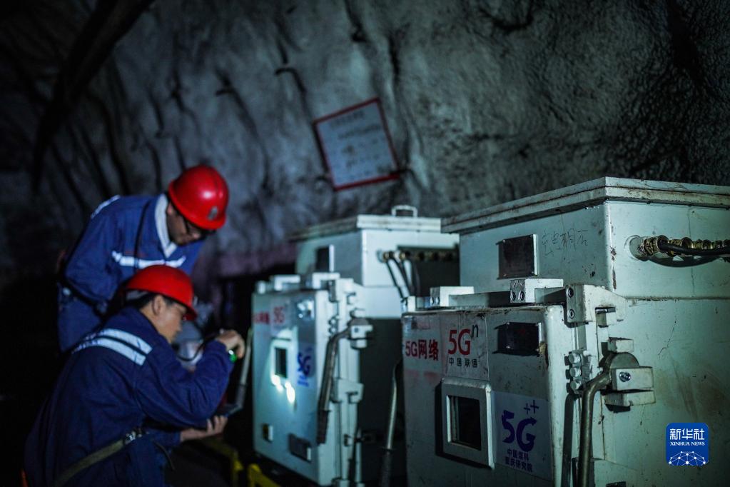 貴州盤(pán)江精煤股份有限公司山腳樹(shù)礦工作人員在井下檢查5G基站控制器運行情況(5月18日攝)。新華社記者 陶亮 攝