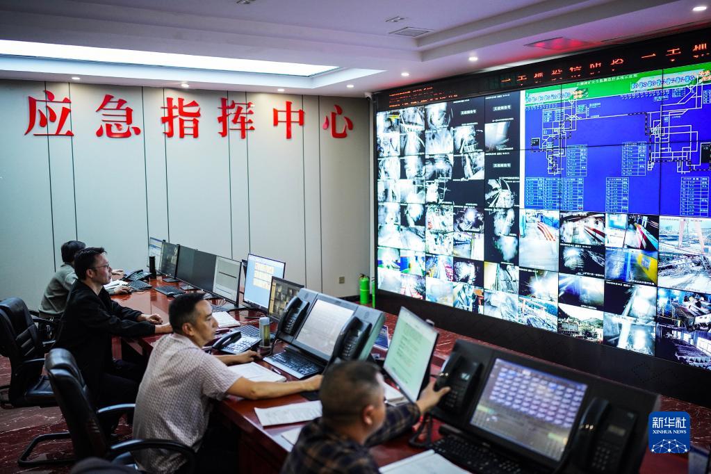 貴州盤(pán)江精煤股份有限公司山腳樹(shù)礦礦長(cháng)王海濤(左二)與管理人員在應急指揮中心進(jìn)行綜合調度(5月18日攝)。新華社記者 陶亮 攝
