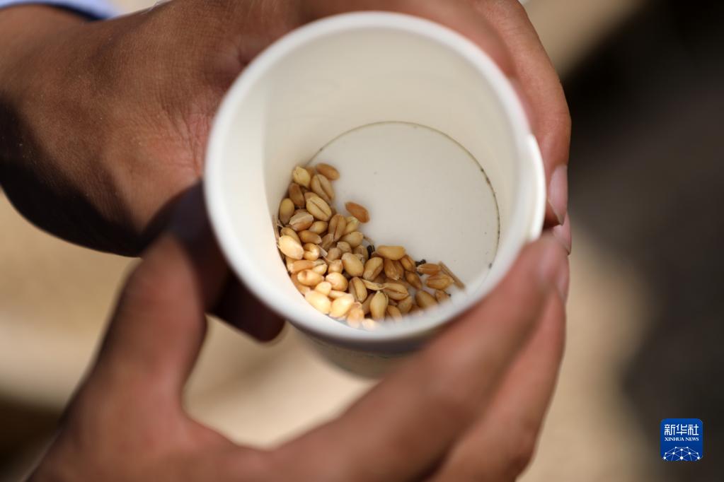 6月2日,在山東省臨沂市郯城縣郯城街道,裁判組工作人員展示在框取的測評區域之內撿拾的麥粒。新華社發(fā)(張春雷攝)