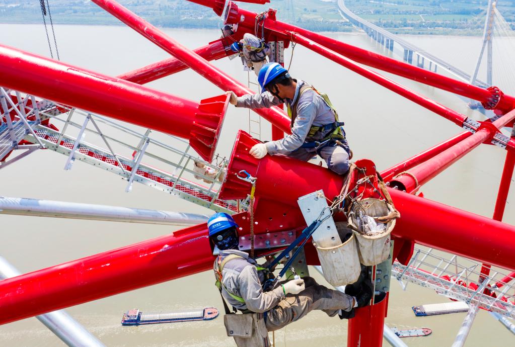 該長(cháng)江跨越塔全高345米,重達5107噸,首次采用±800千伏線(xiàn)路與雙回交流500千伏線(xiàn)路同塔方式跨越長(cháng)江。