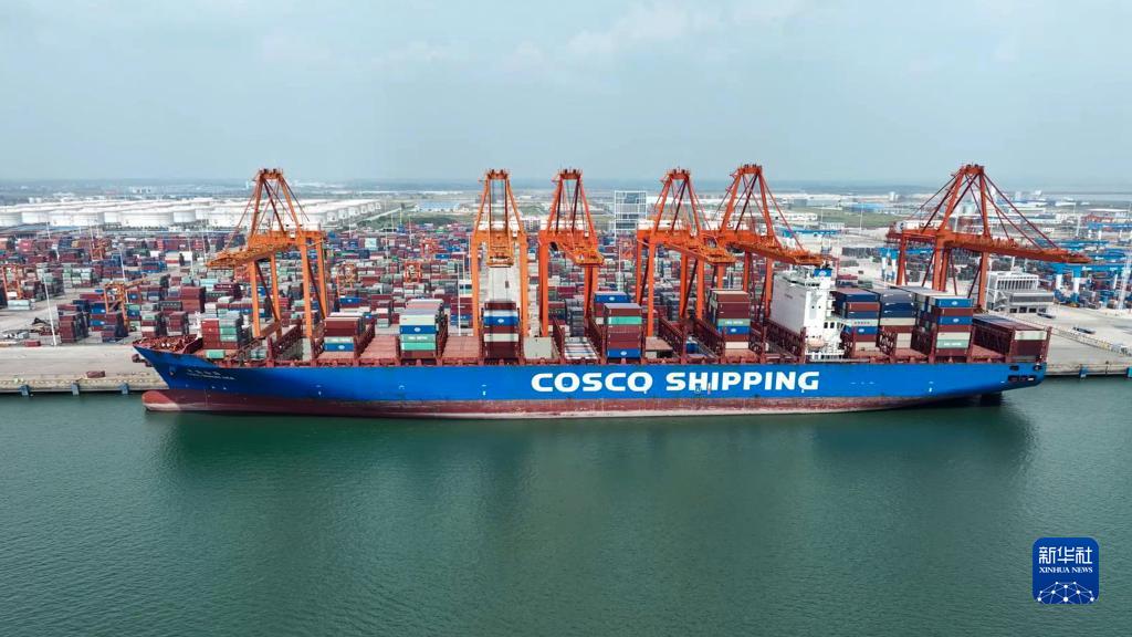 9月13日,一艘海輪??吭跉J州港碼頭裝卸貨物。新華社記者 張愛(ài)林 攝