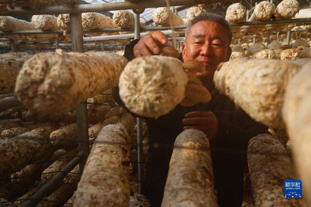 2022年12月26日,在河北省阜平縣色嶺口村,村民顧軍在食用菌大棚采摘香菇。新華社發(fā)(李秀芹 攝)